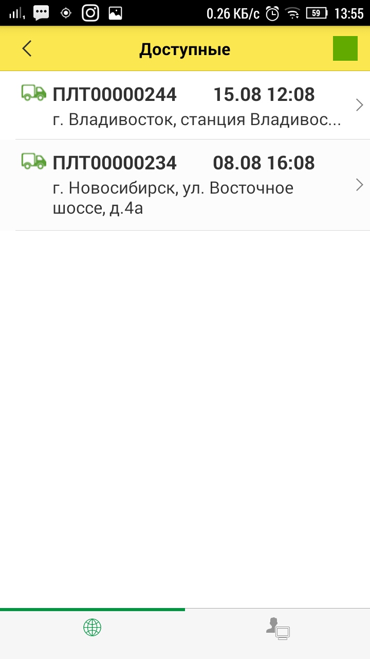 После входа в базу, водитель видит список рейсов назначенных на него. Так же в списке водитель видит номер заказа, дату и время прибытия на первый адрес, и непосредственно сам адрес. Для получения более подробной информации и/или для работы с заказом необходимо нажать на сам заказ.