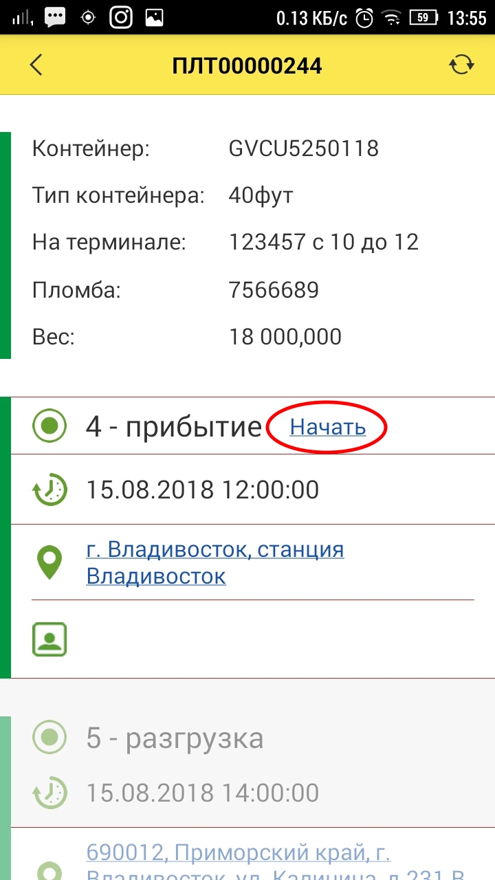 По прибытию на адрес водитель должен нажать кнопку «Начать» для фиксации даты и времени прибытия на адрес.