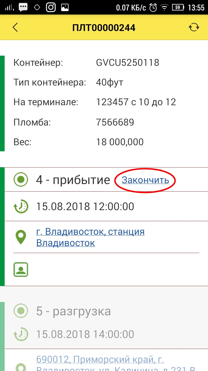 По завершению погрузки/разгрузки на адресе водитель должен нажать кнопку «Закончить» для фиксации даты и времени убытия с адреса.